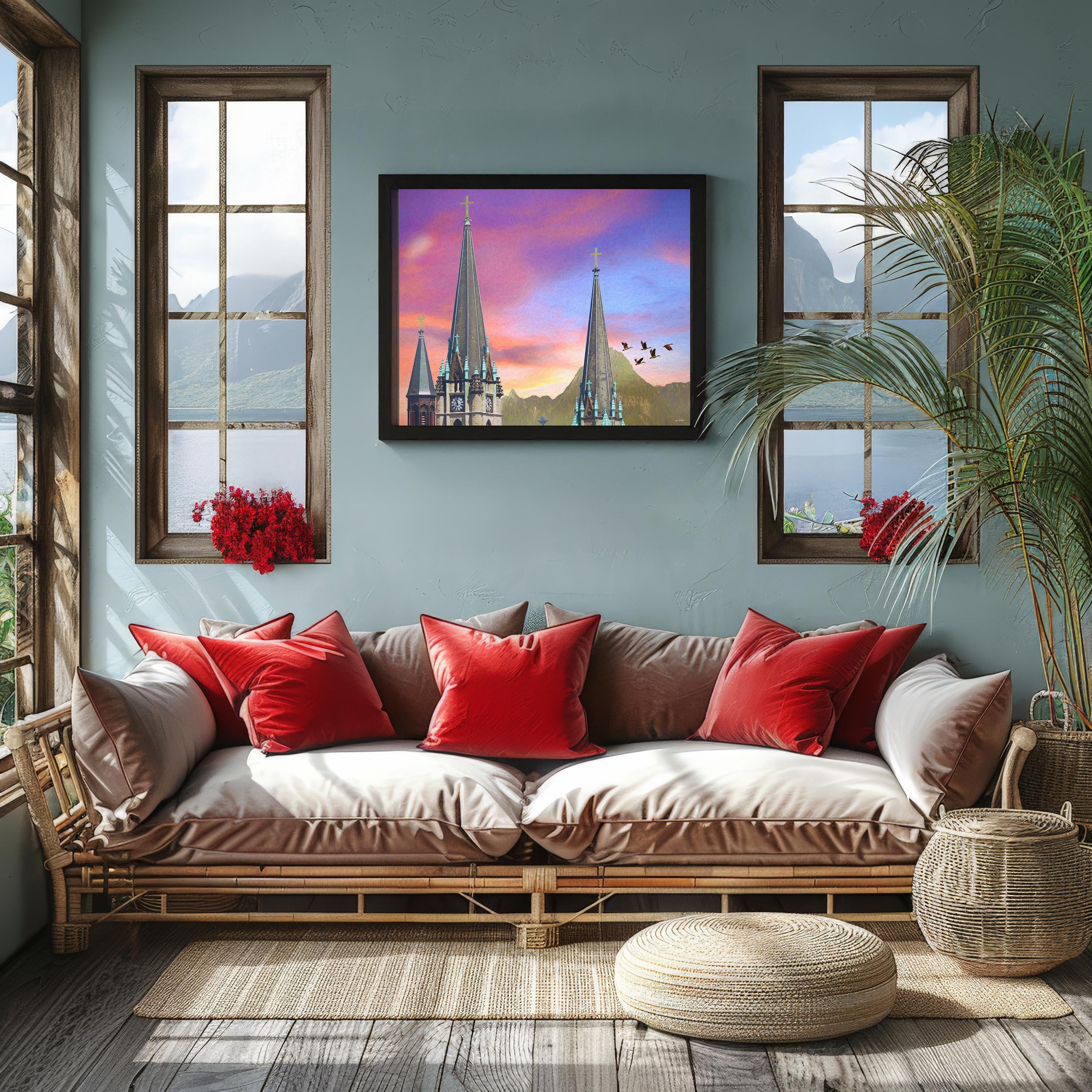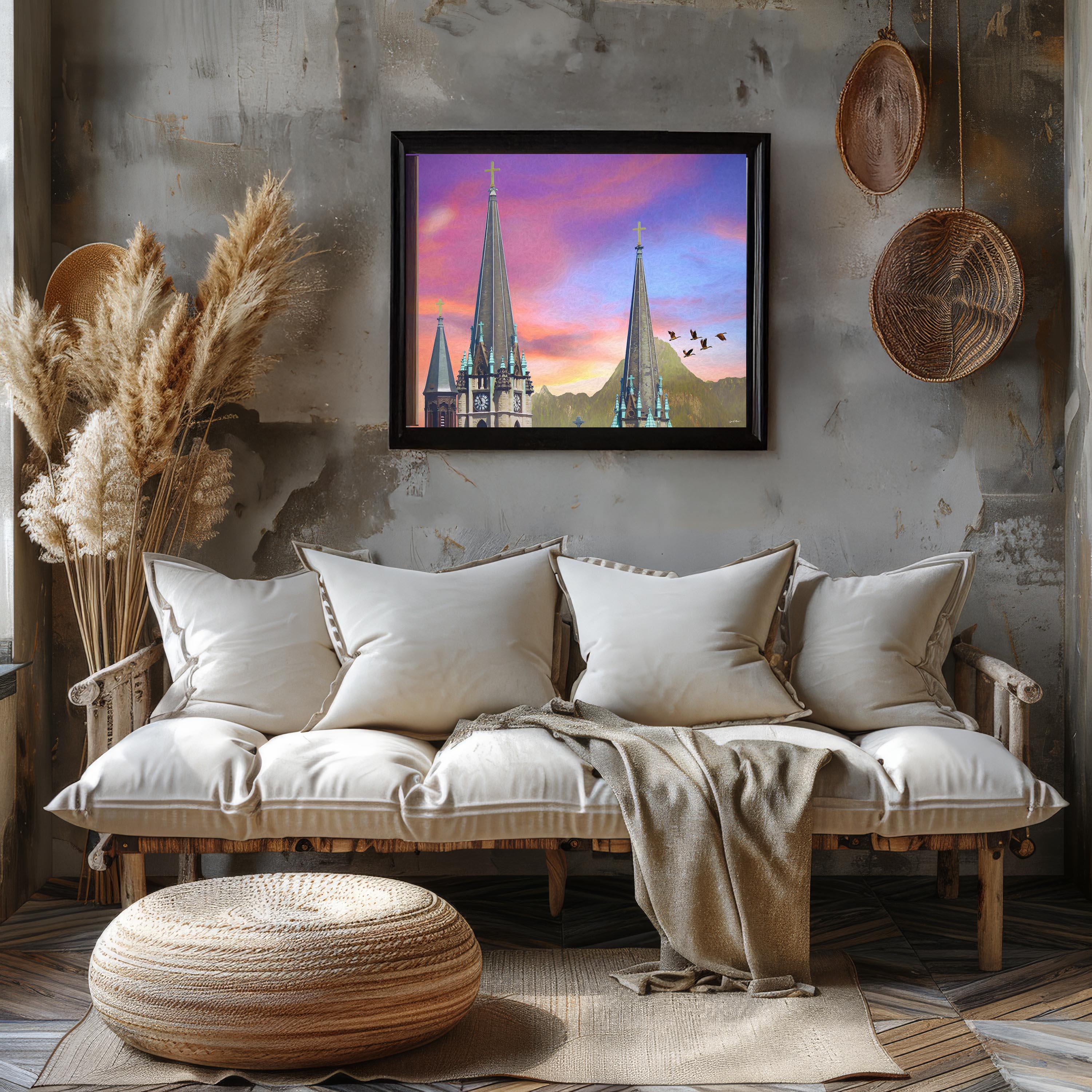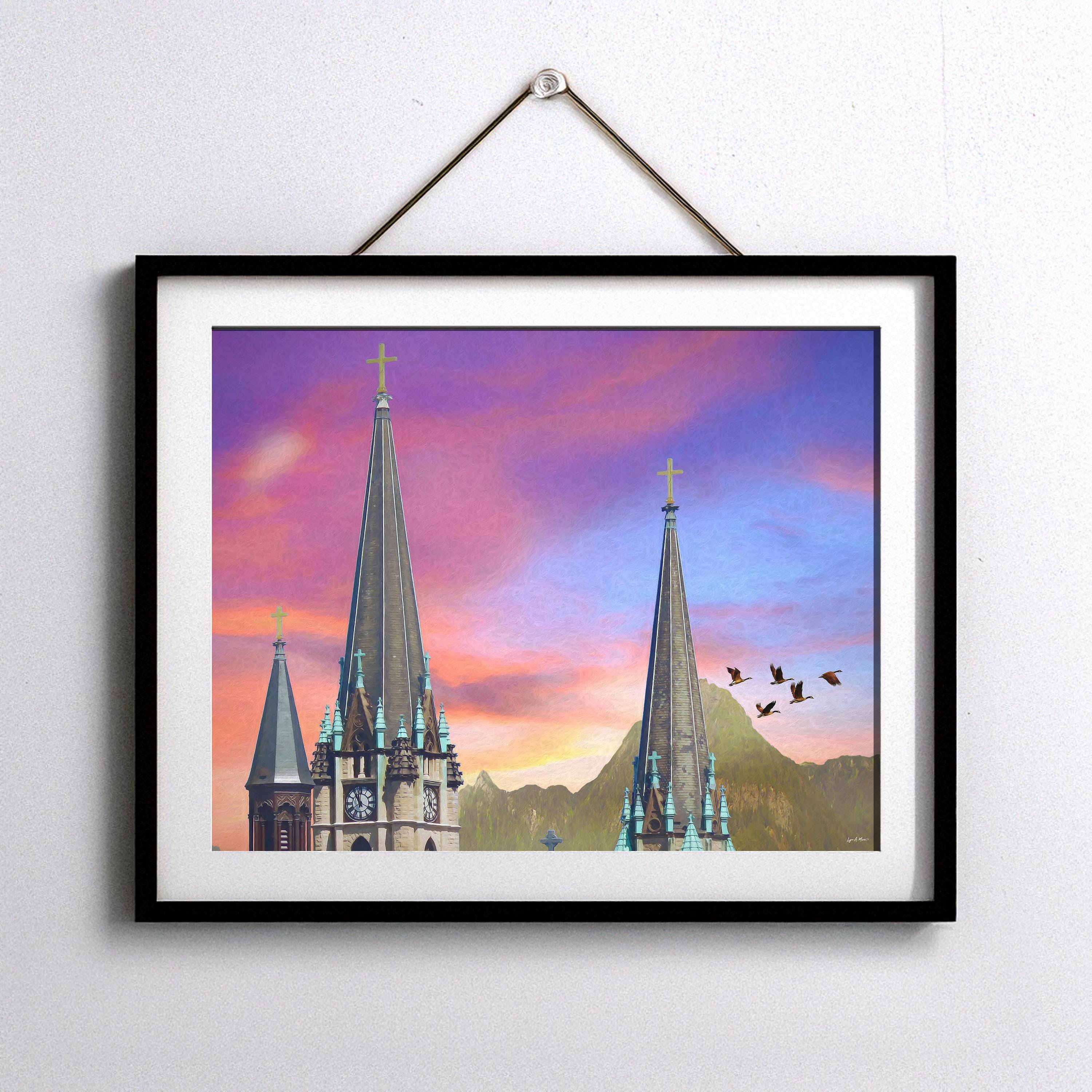 I created this to capture a quiet meeting of faith and nature, steeples reaching up, mountains standing steady, and evening sky guiding a small flock home. It’s about hope, place, and the calm that settles at sunset.