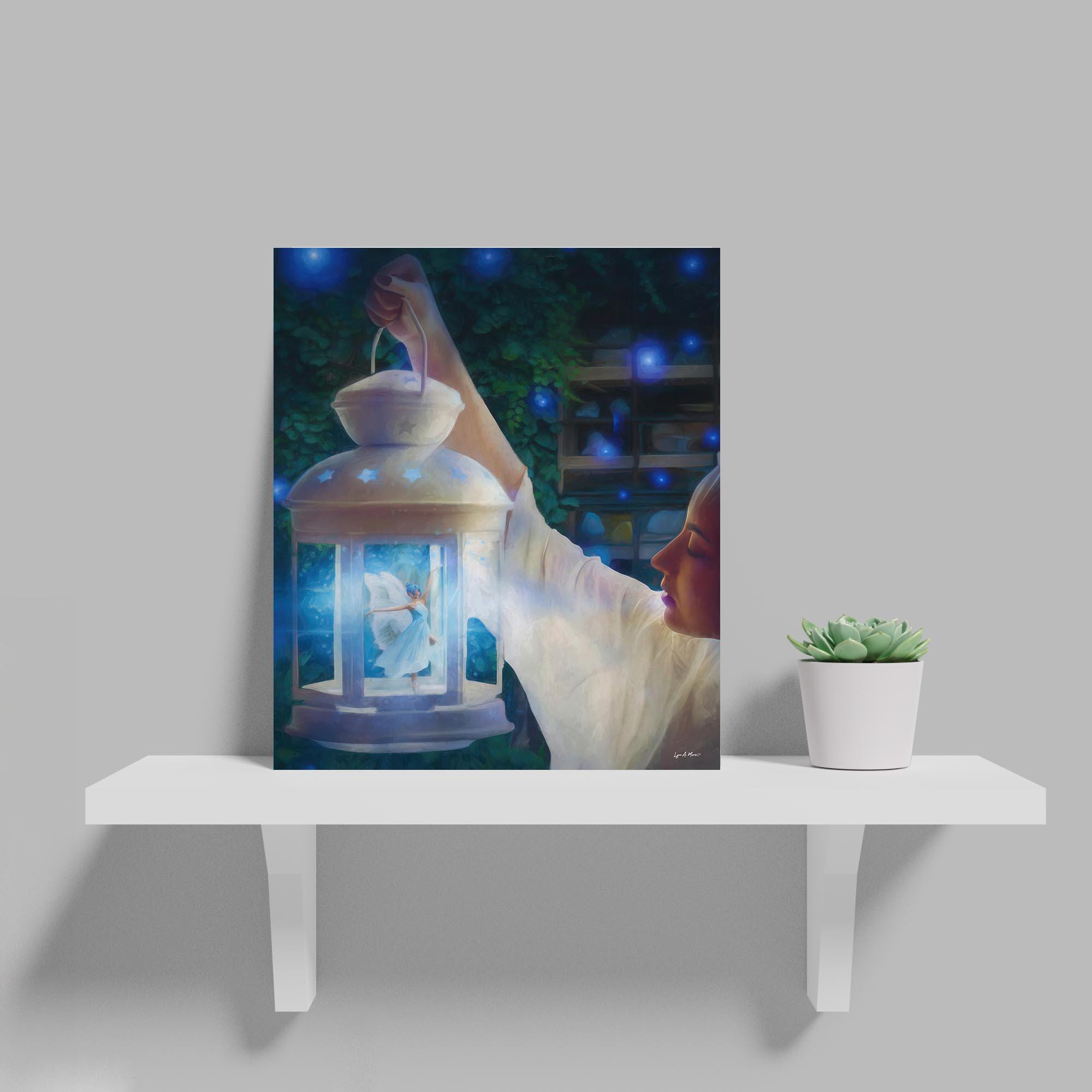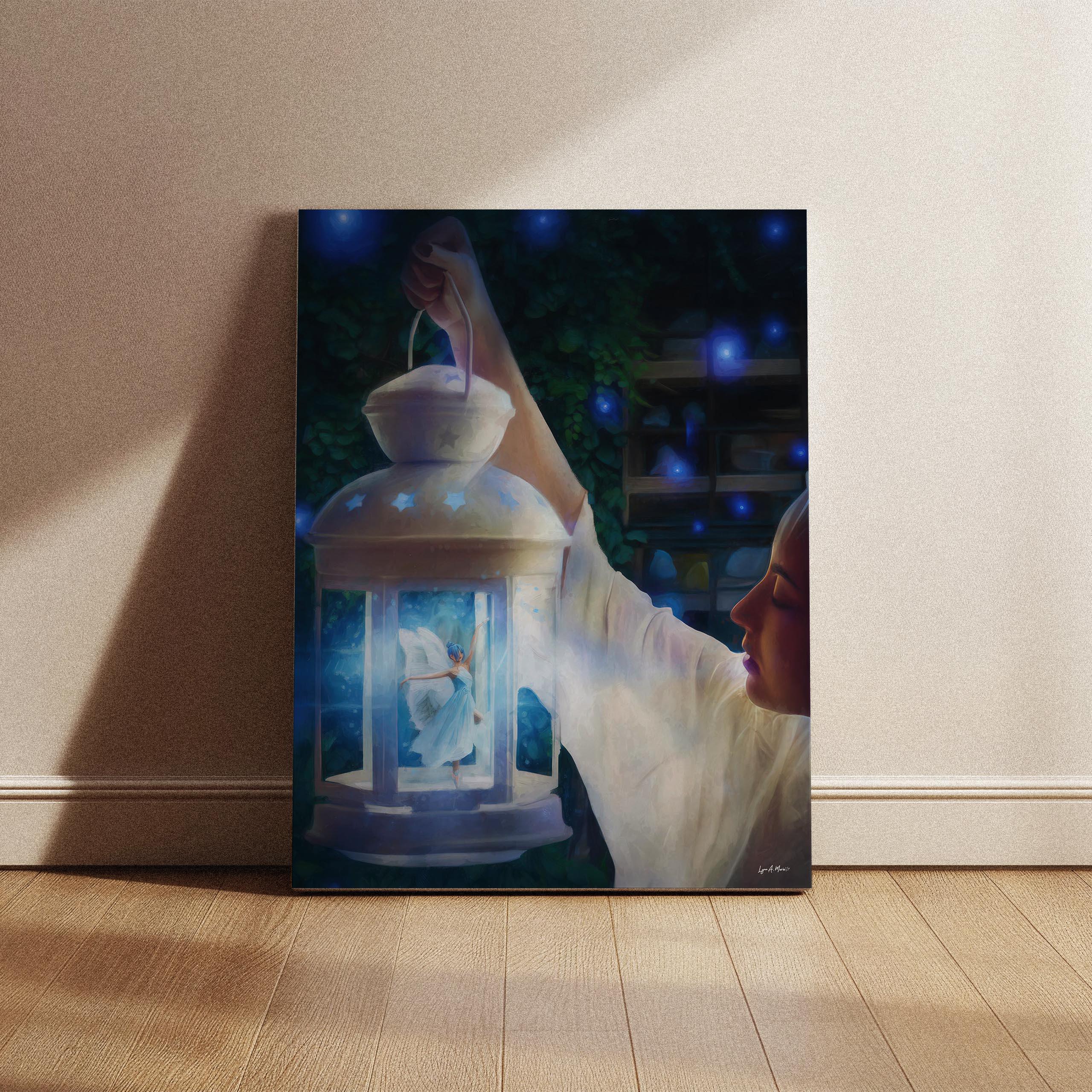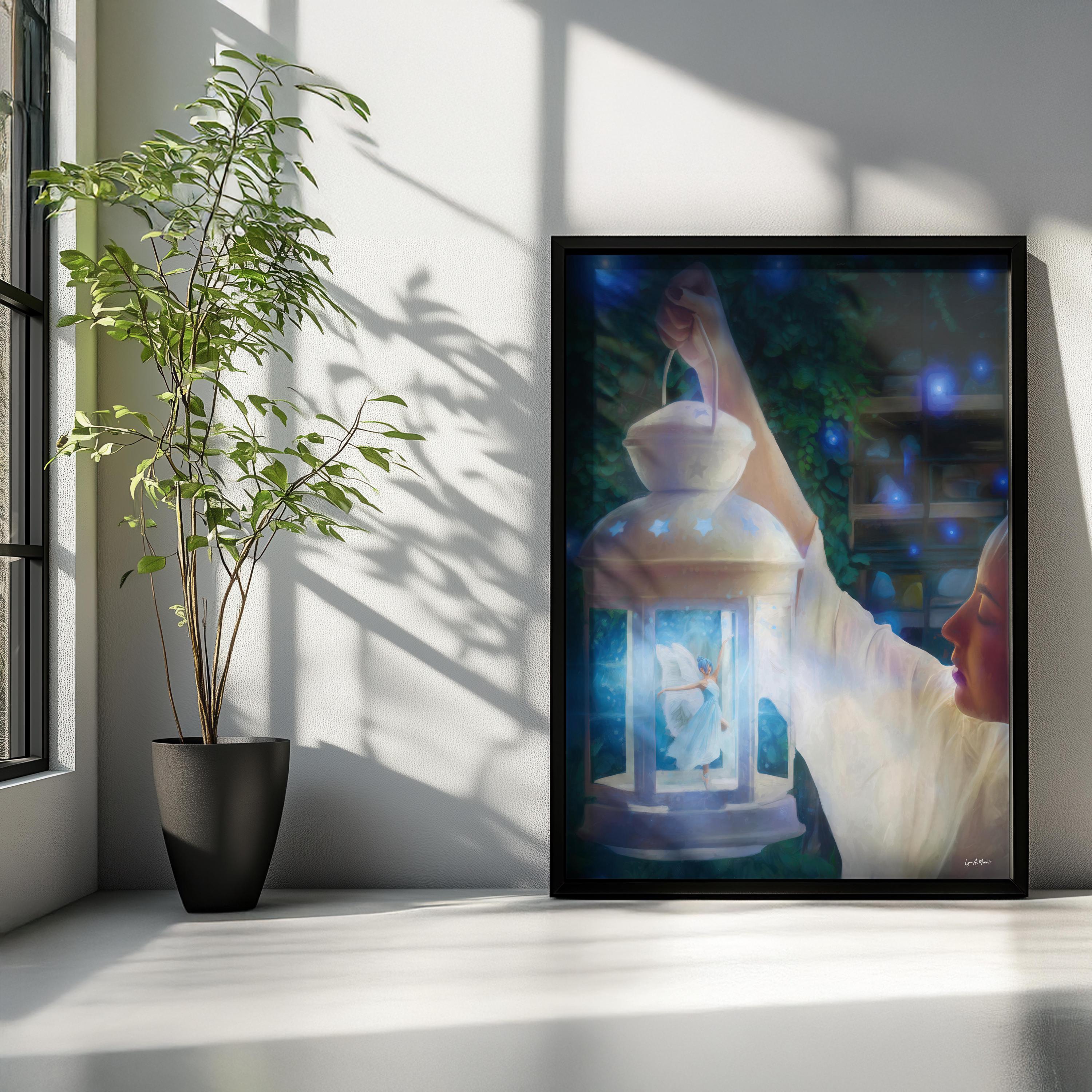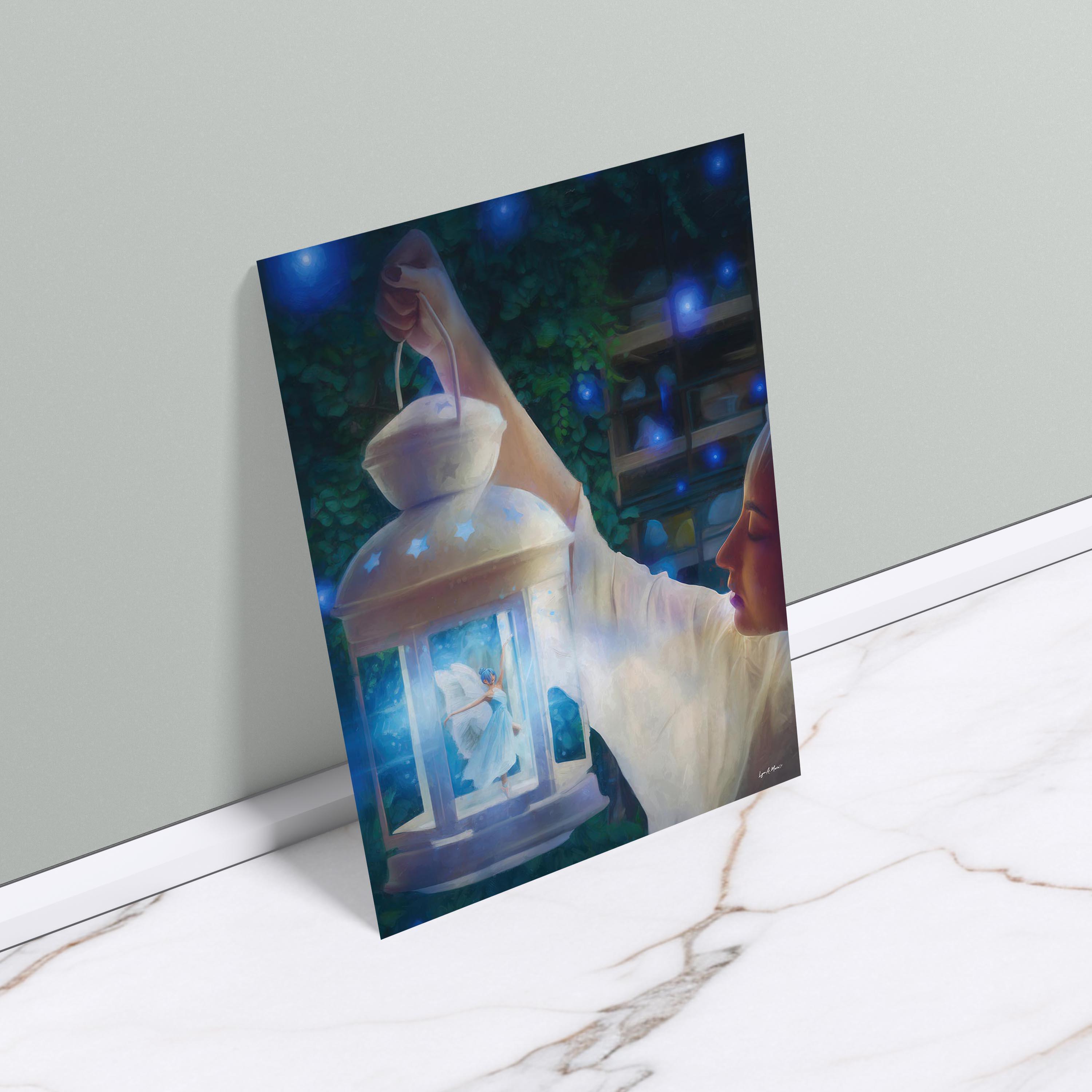 I created this airy lantern scene to bring a touch of fantasy wall art and magical decor into everyday spaces. The glowing fairy adds warmth and whimsy, making this lantern print perfect for cottagecore art and peaceful night scene art. Digitally created, this signed art is not AI generated and crafted for lovers of whimsical art and blue fantasy. This fantasy art print reflects my love for soft light and storytelling.