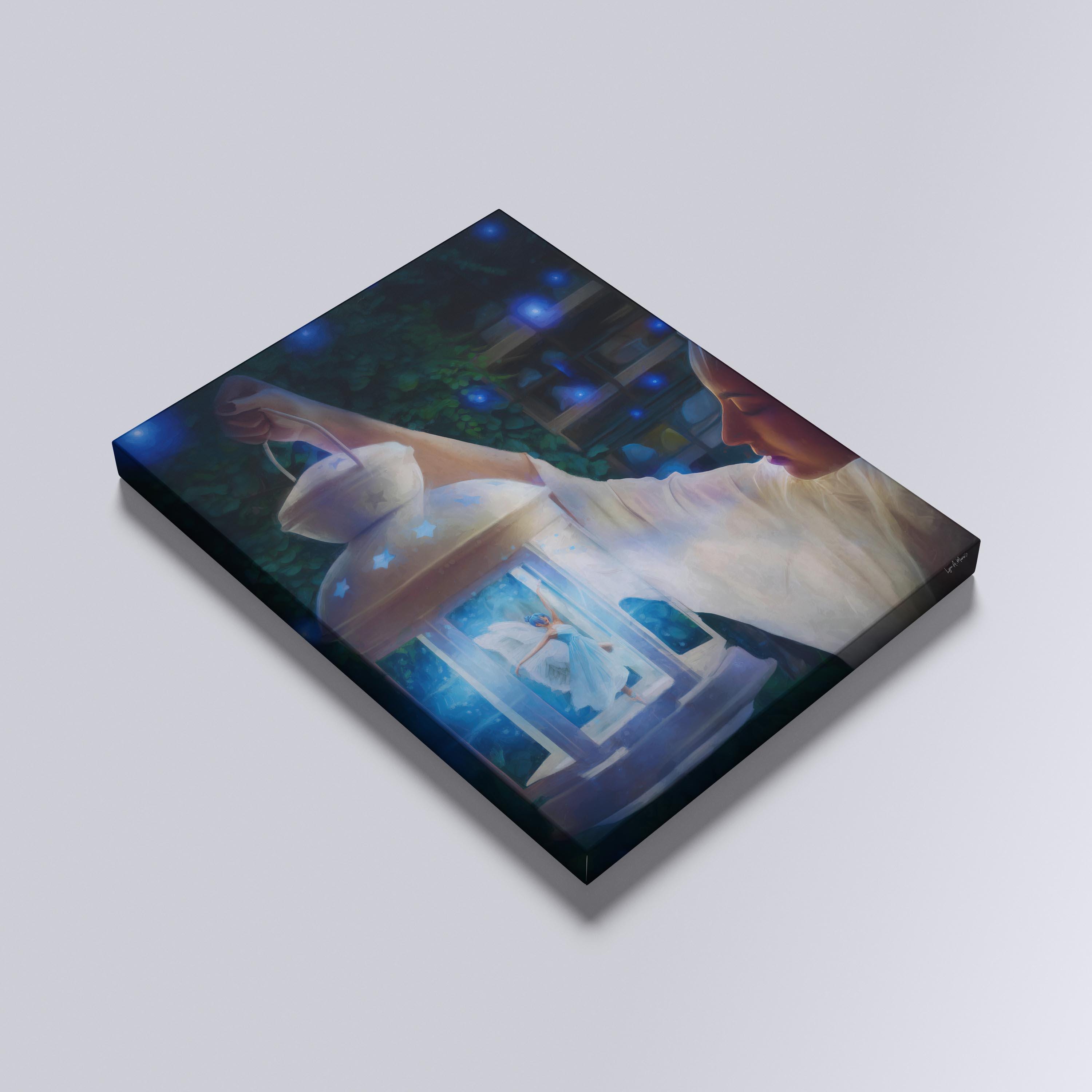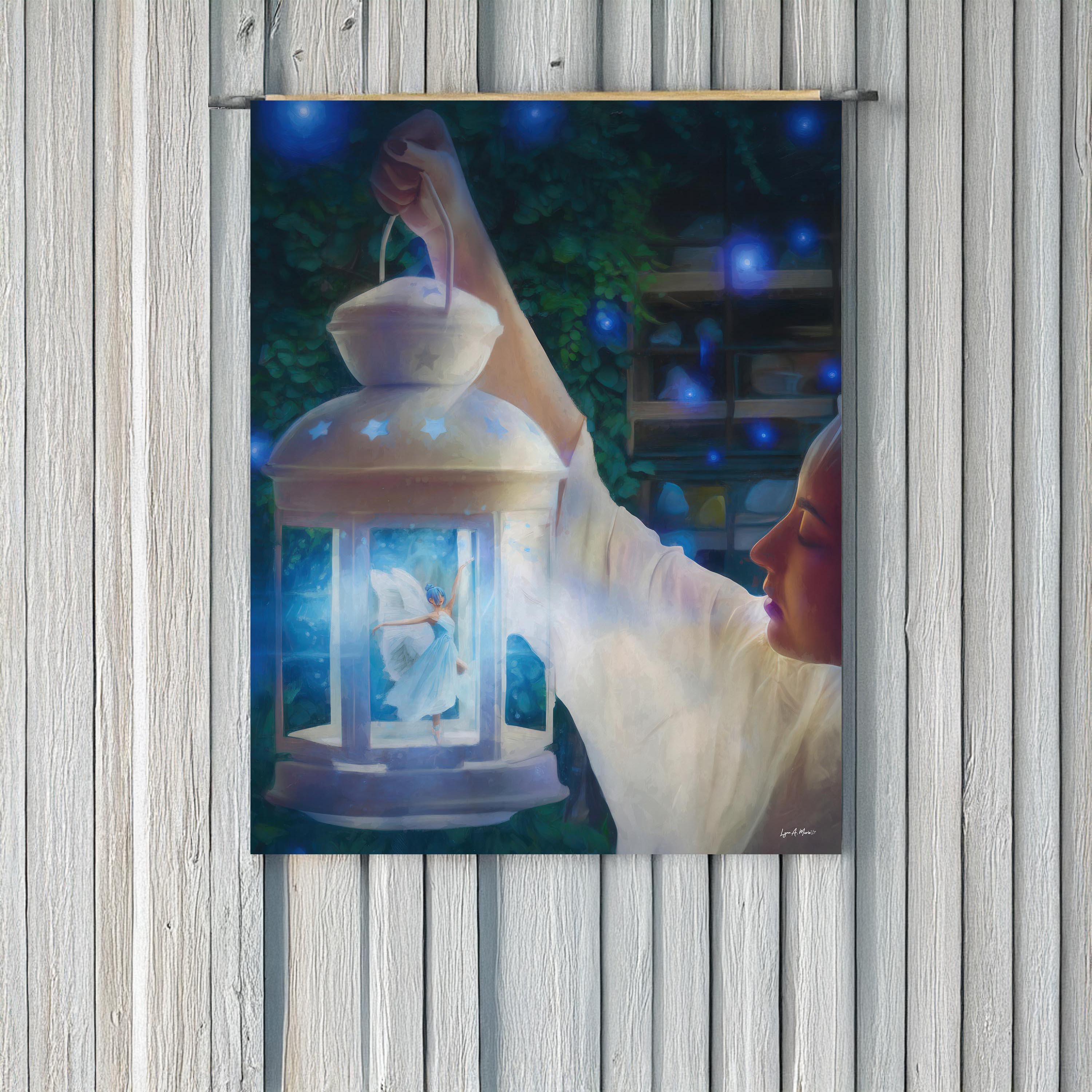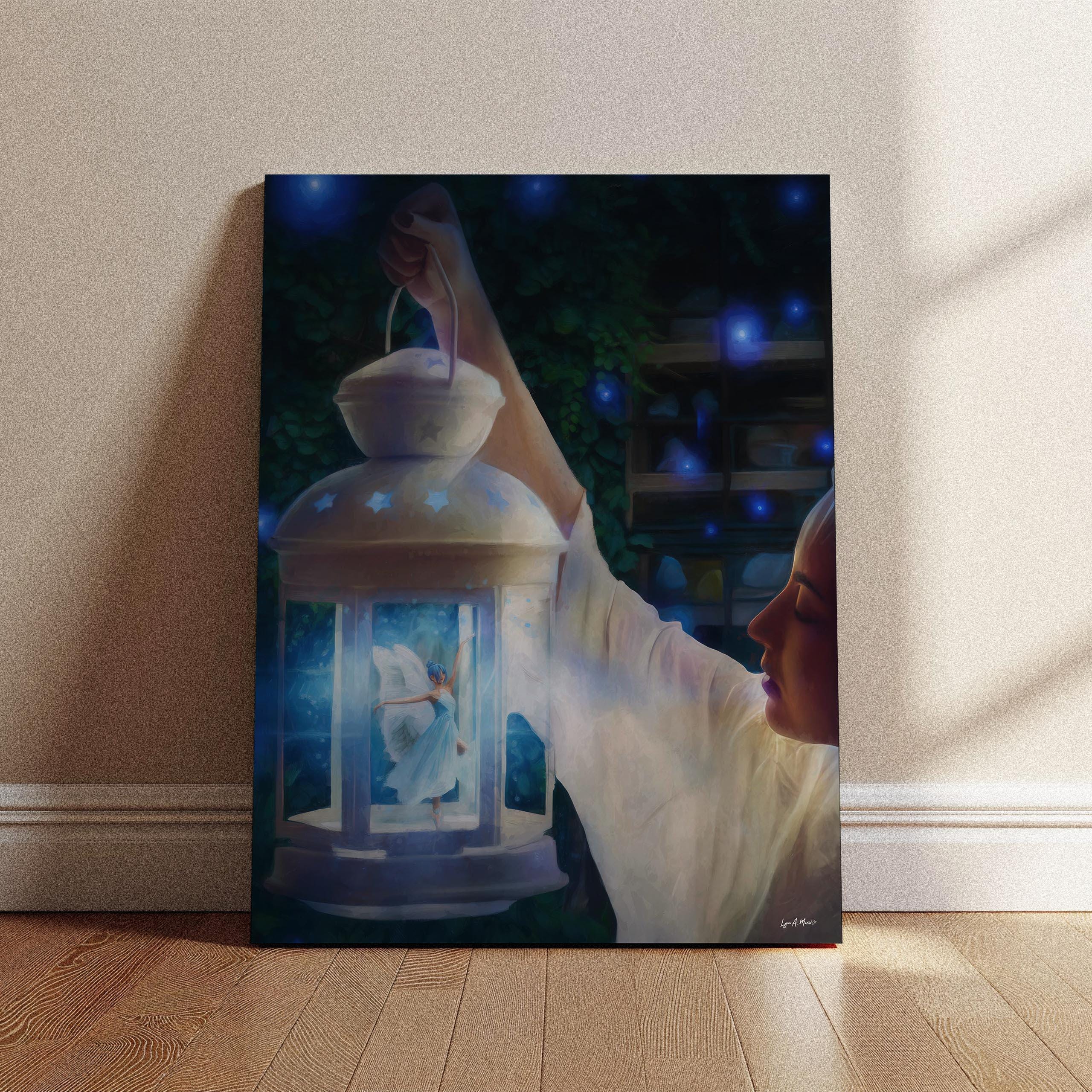 I created this to bottle up a little wonder, the feeling of finding magic on a quiet night. The glowing lantern, tiny ballerina fairy, and soft blues are my way of telling a bedtime-story scene you can keep on the wall.