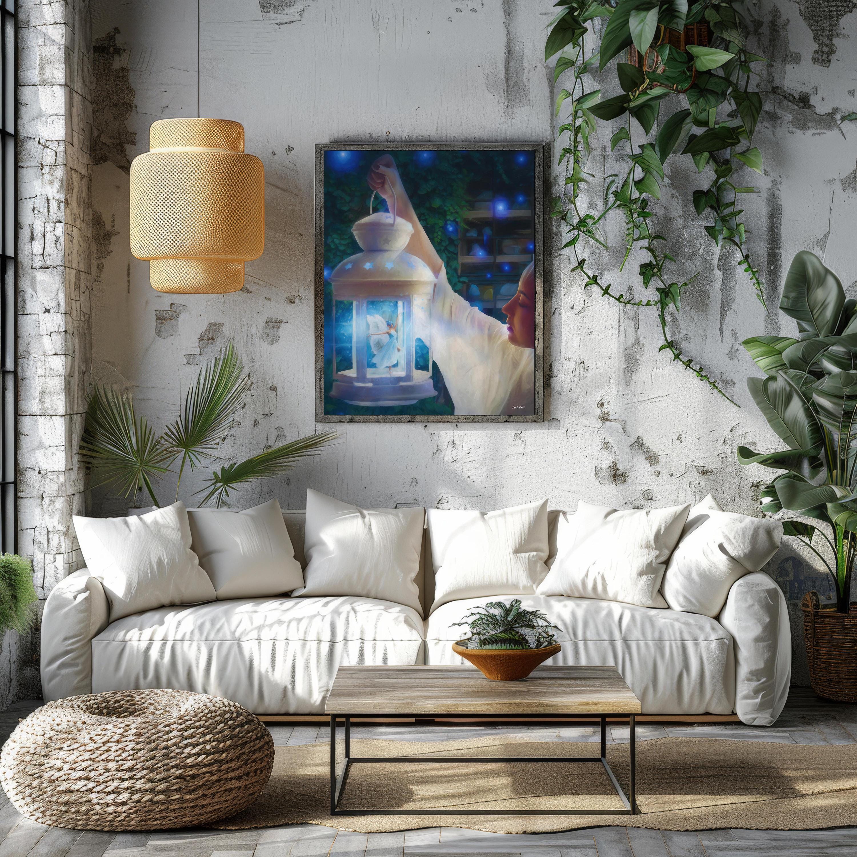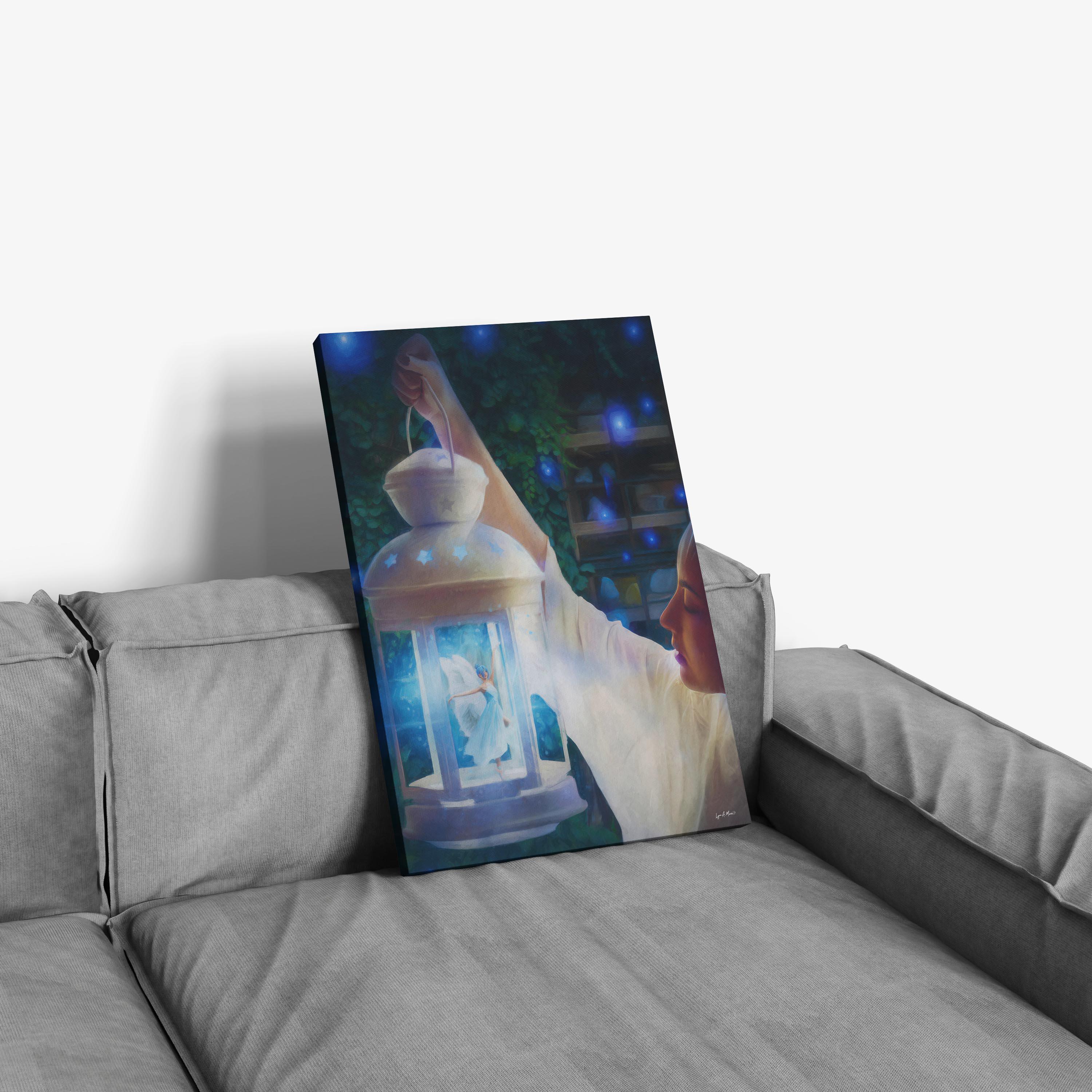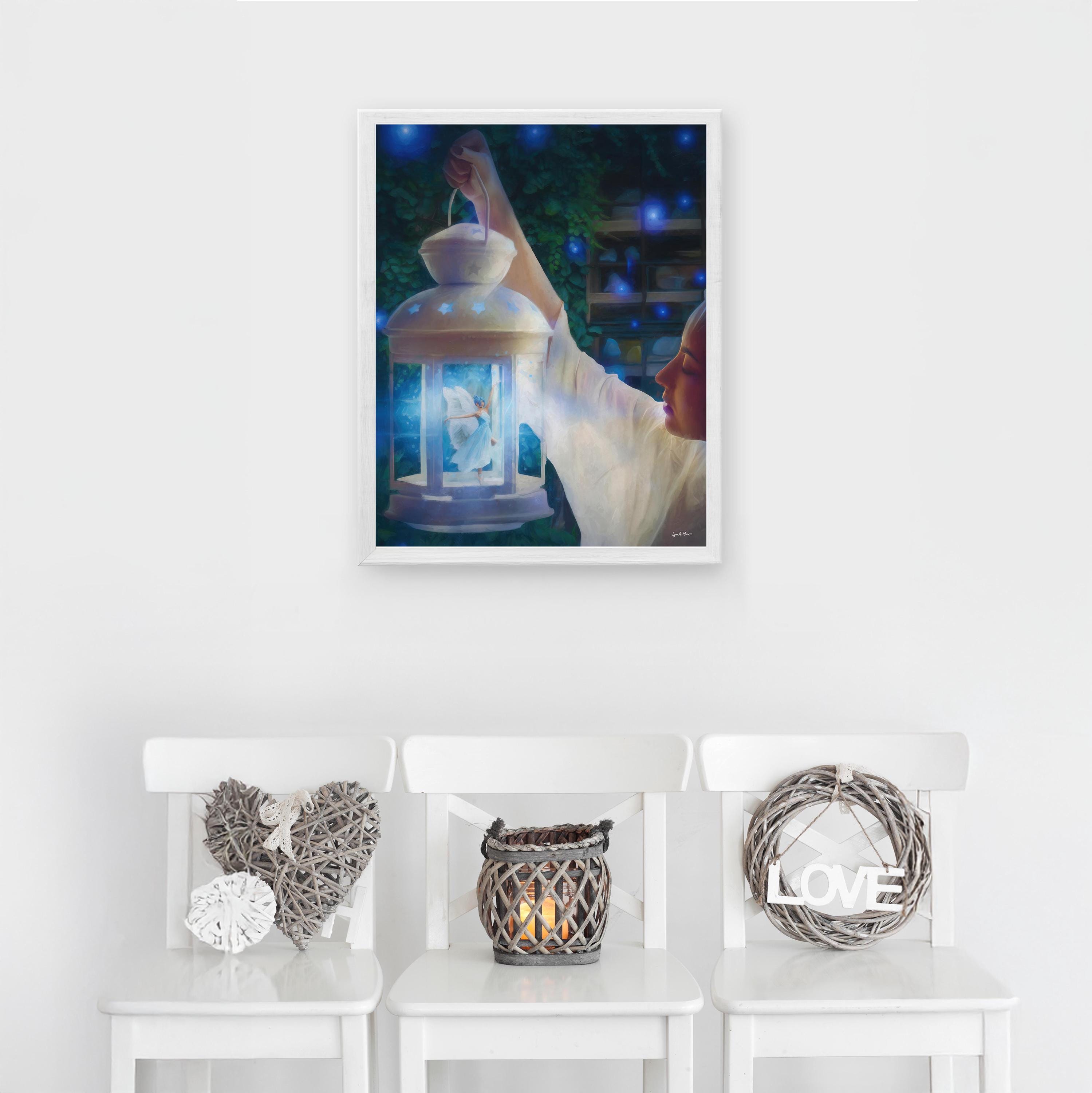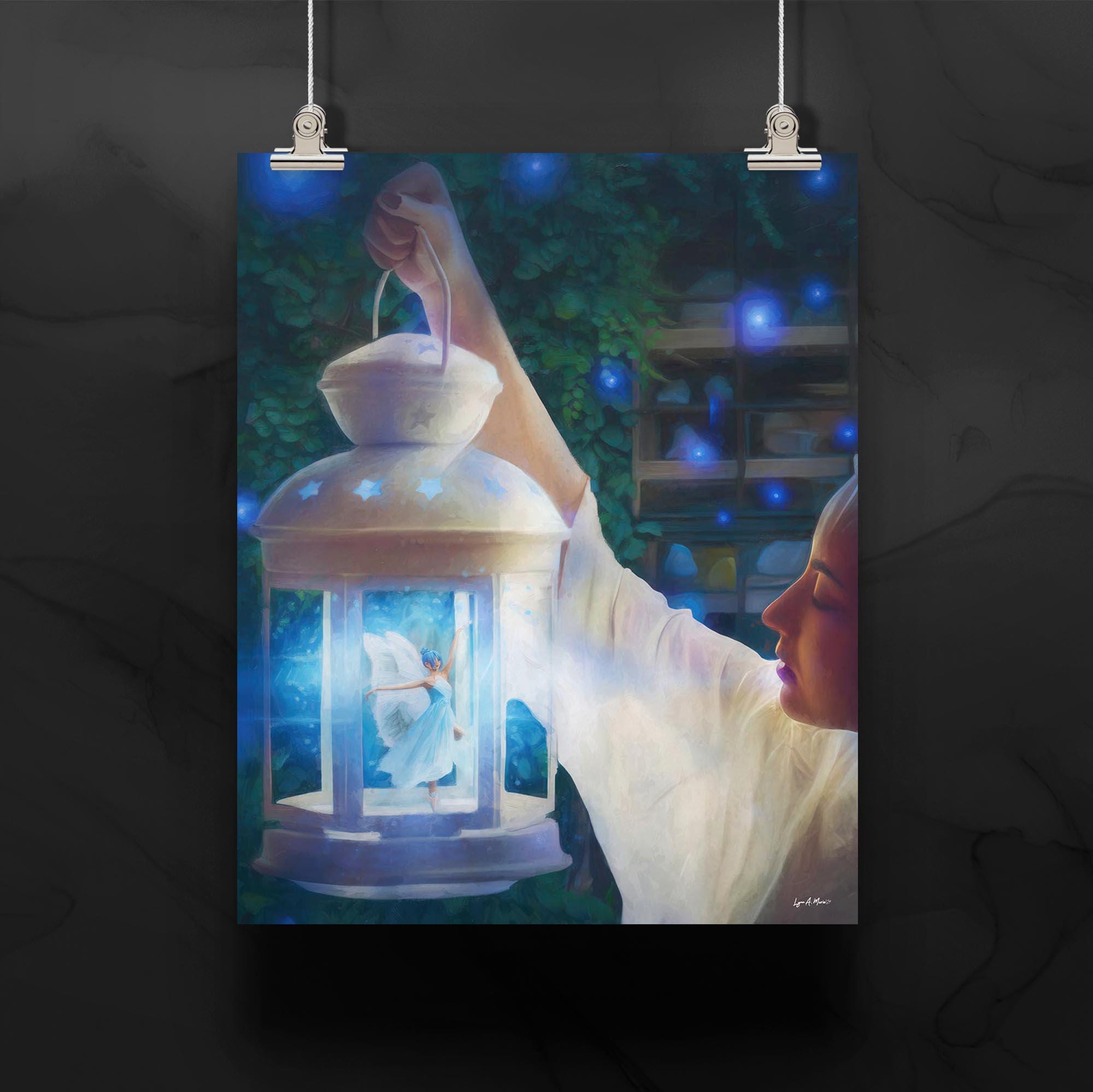 I created this to bottle up a little wonder, the feeling of finding magic on a quiet night. The glowing lantern, tiny ballerina fairy, and soft blues are my way of telling a bedtime-story scene you can keep on the wall.